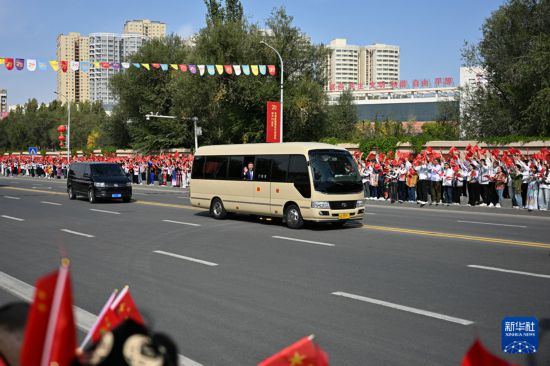 9月23日下午,中共中央总书记、国家主席、中央军委主席习近平率中央代表团乘专机抵达乌鲁木齐,出席新疆维吾尔自治区成立70周年庆祝活动。这是从机场到住地途中,习近平向沿途欢迎的群众挥手致意。新华社记者 辛悦卫 摄