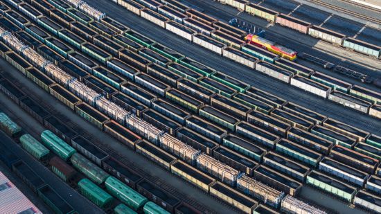 2025年10月18日,在中国铁路哈尔滨局集团有限公司绥芬河站南场,满载进口货物的列车等待解体换装(无人机照片)。新华社发(曲艺伟 摄)
